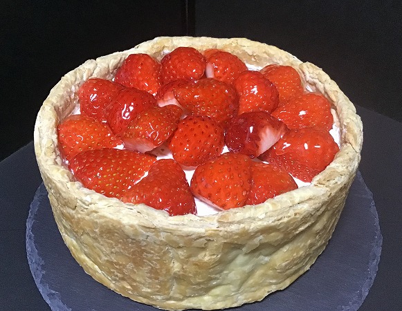 オーレリー自慢のチーズケーキに、「いちご」の風味をギュっと閉じ込めた 「ジュレ」を合わせて、パイ生地に入れました。味も香りも今が一番おいしい 「いちご」をたっぷりのせた、季節最後の「いちごのケーキ」です。